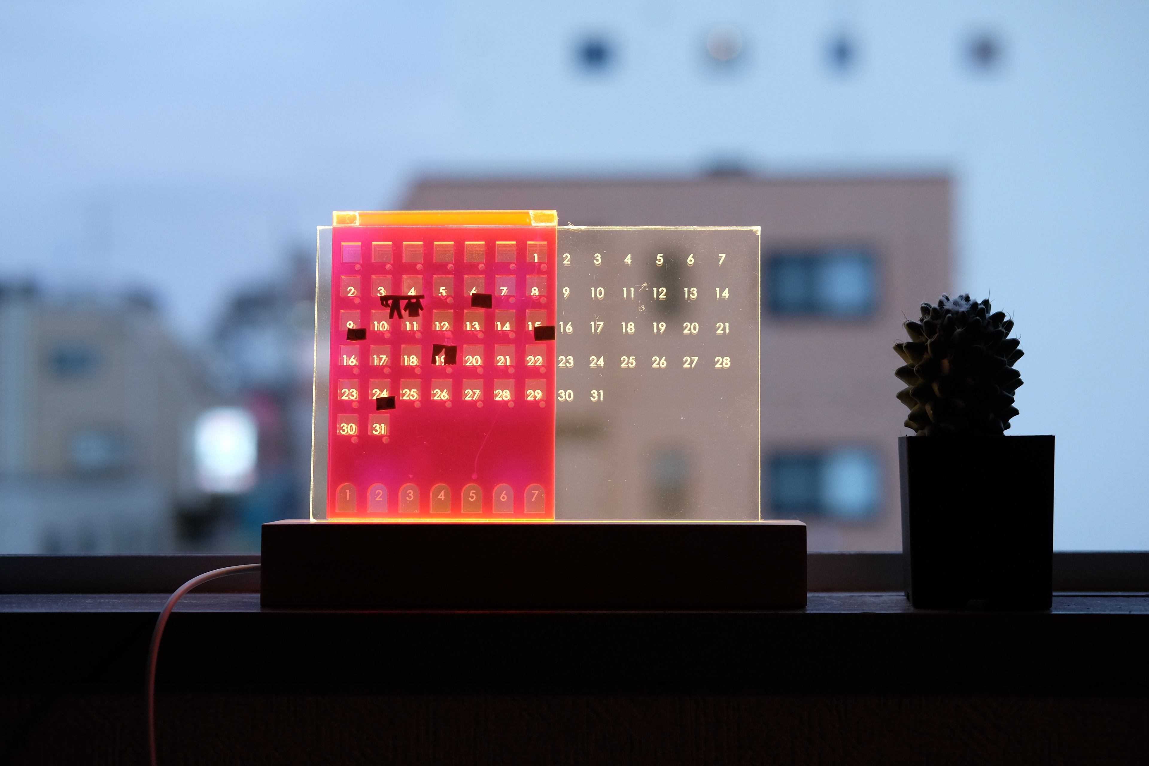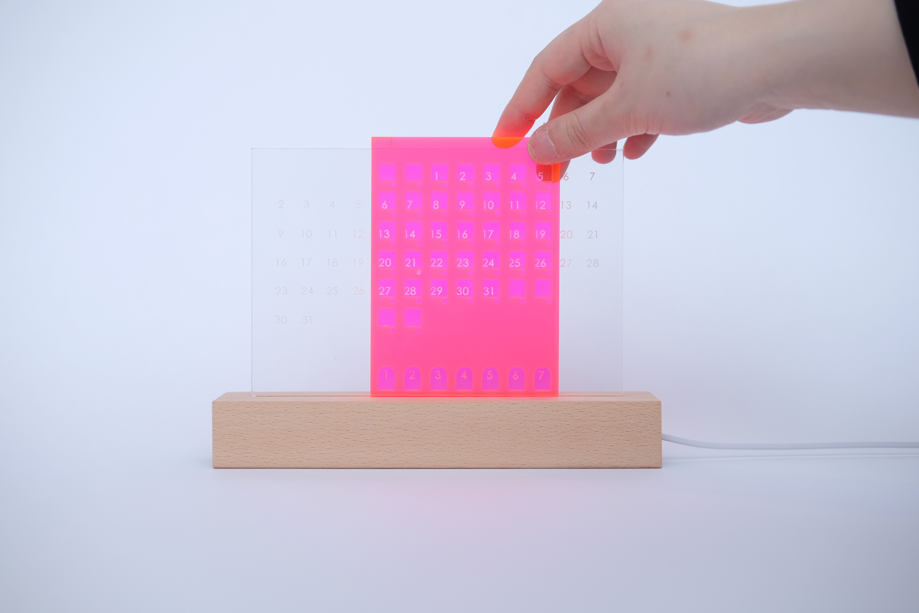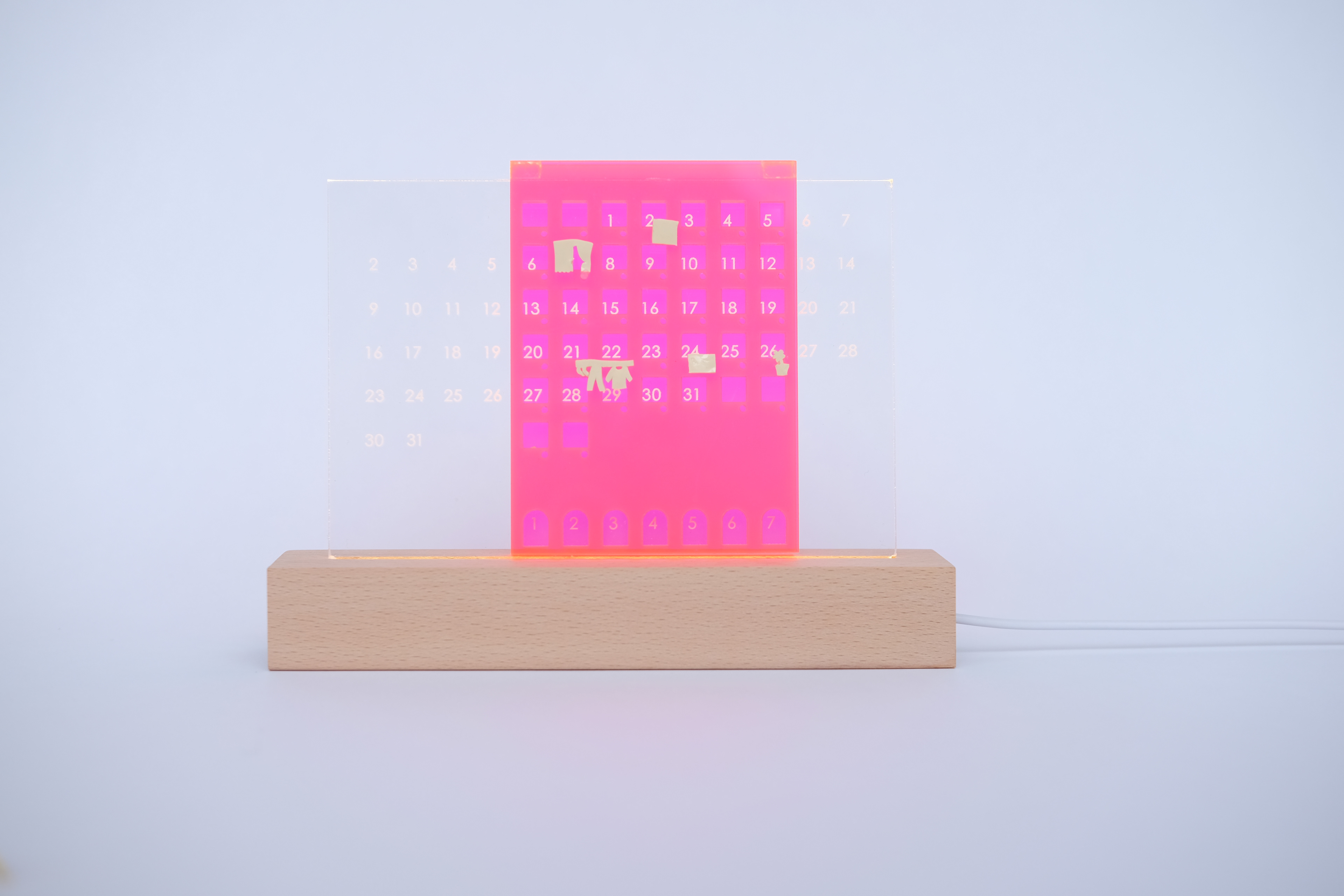 さらに、カレンダーの下にある小さな穴には、休日、元気をくれる日、ワクワク日などをマークすることができる。 ピアスなどの小さなアクセサリーを置いてもできる。高透光性アクリルが暗い環境での点灯状態も非常に和やかだった。 都市で狭い家で生きる若者たちに、温かな安らぎを与えてくれる。