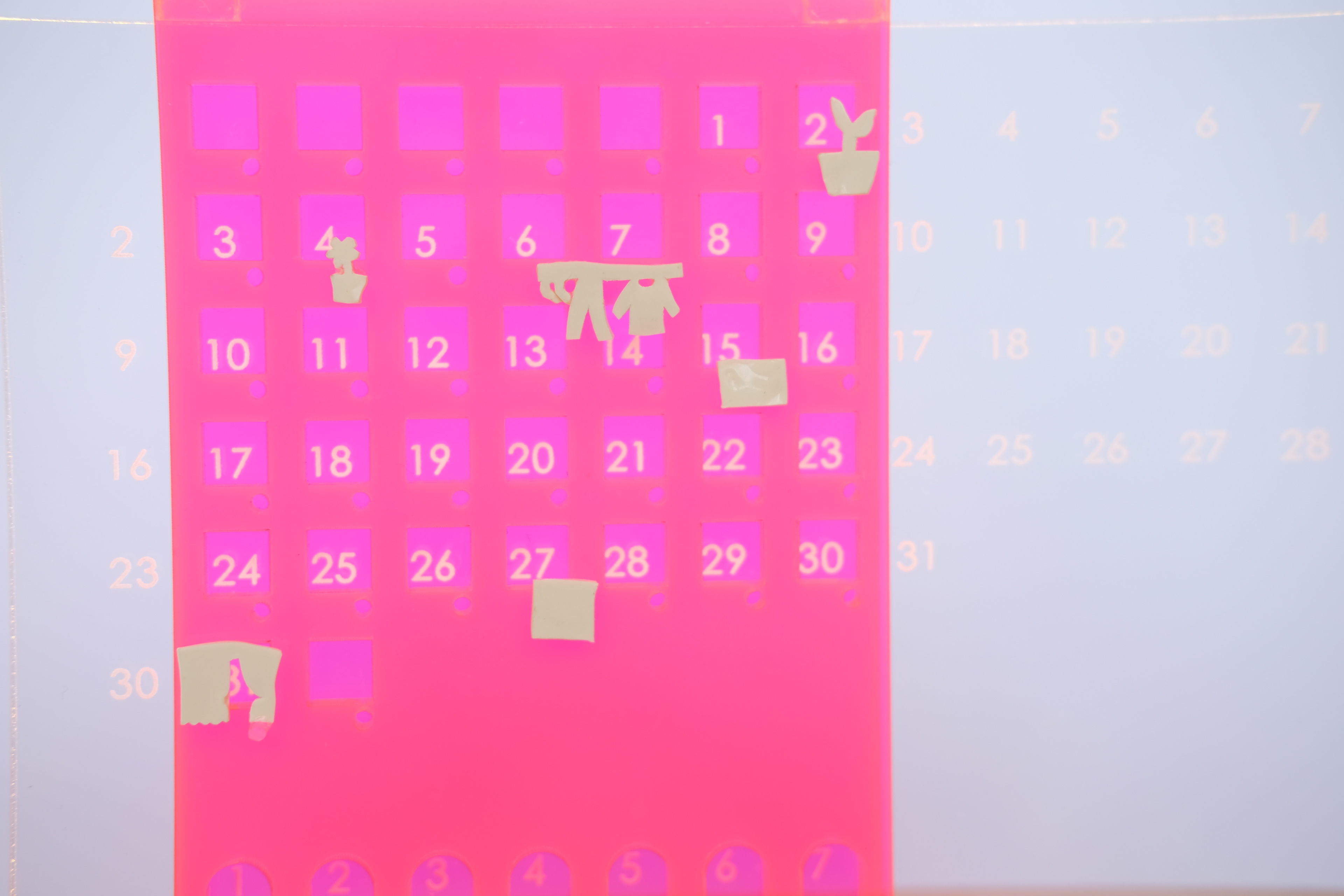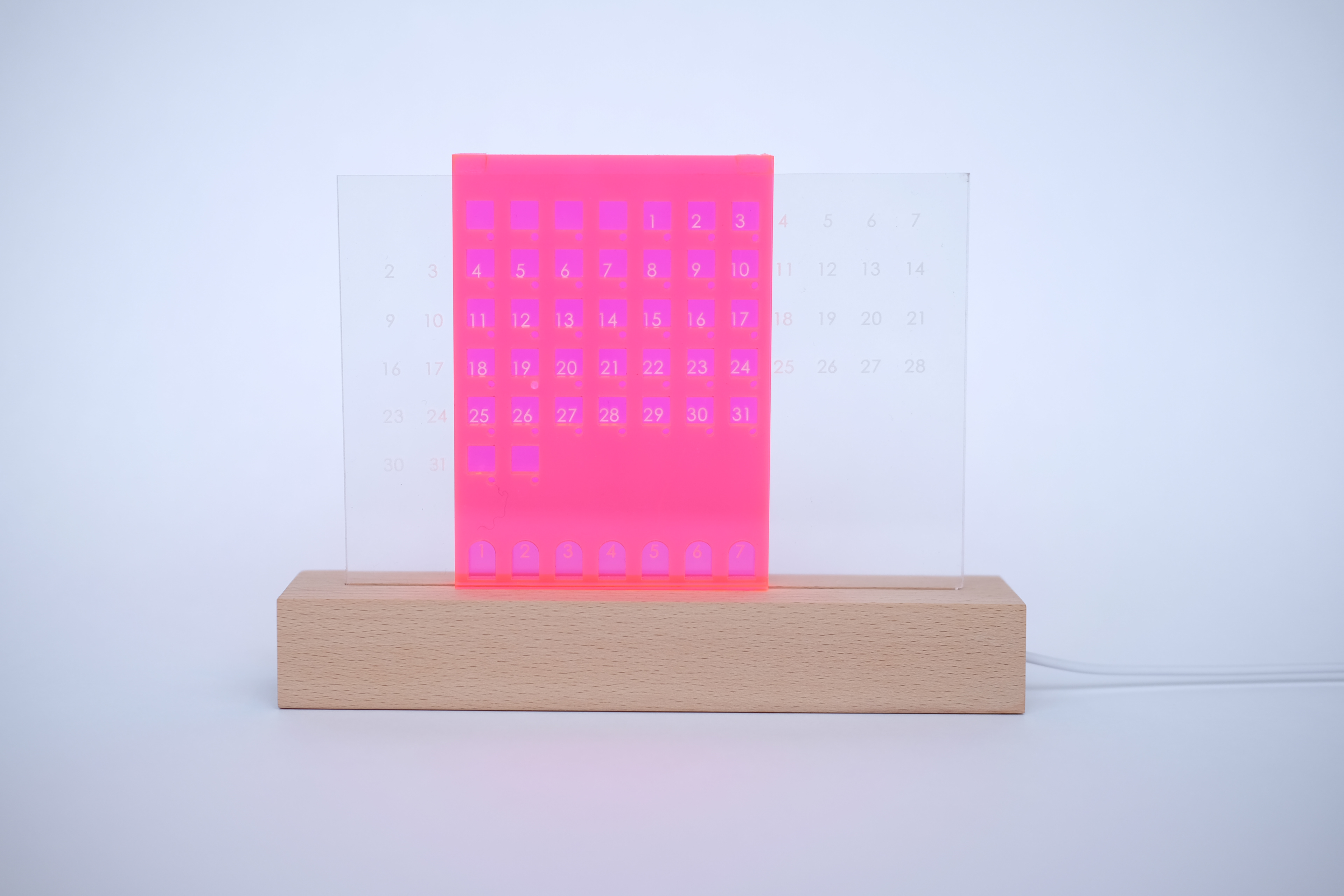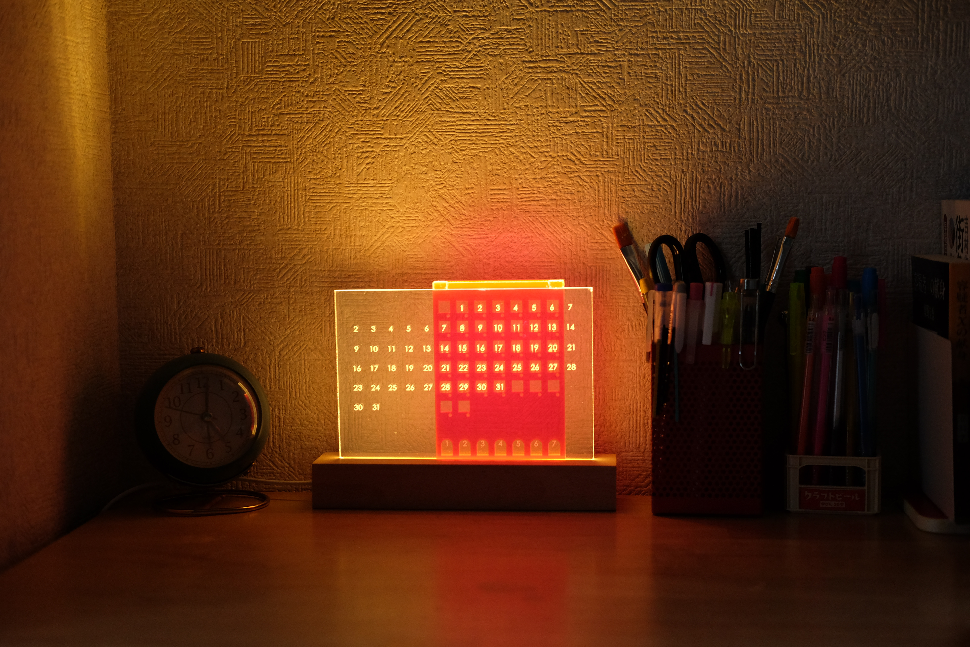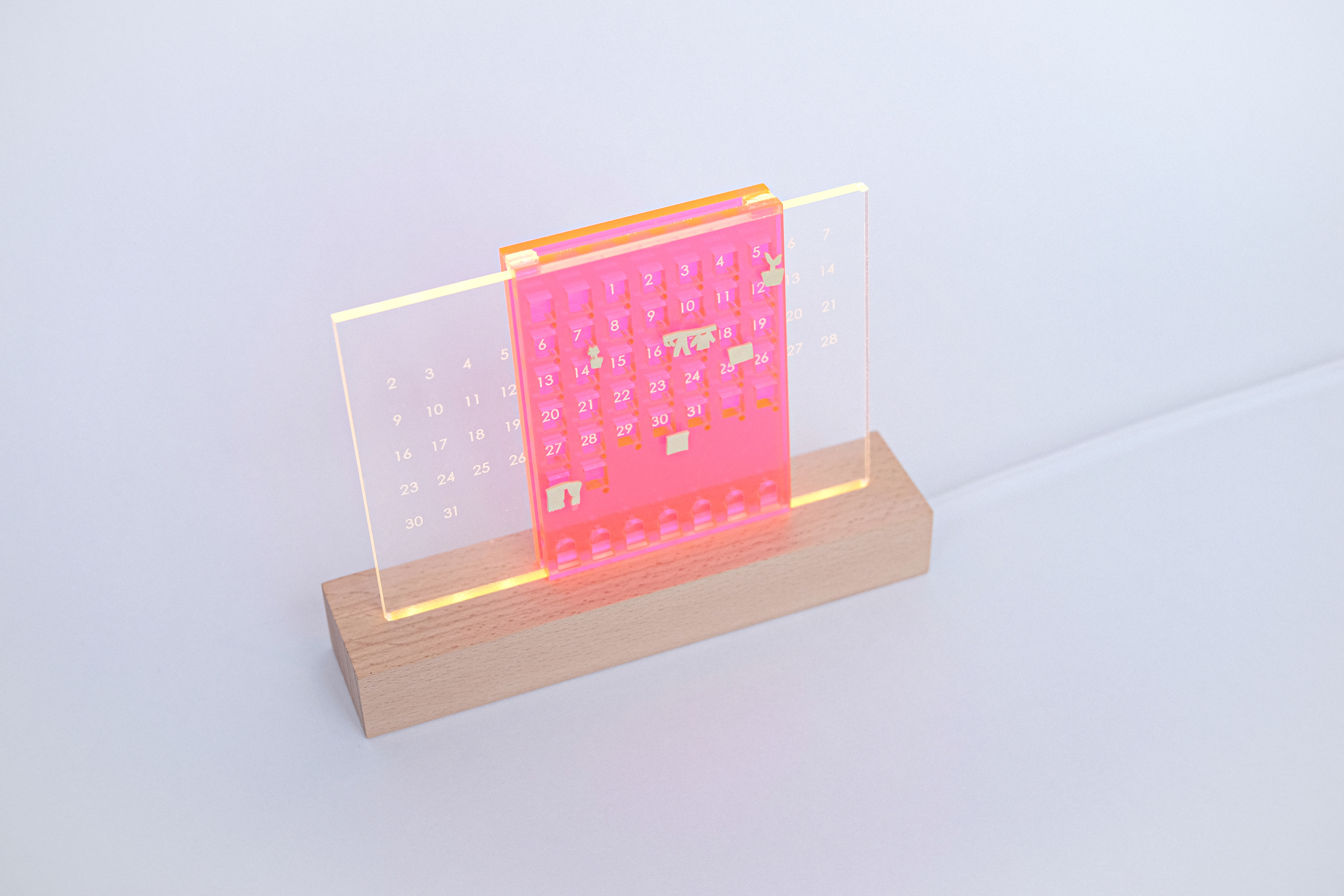 In addition, you can mark holidays, energizing days, exciting days, etc. in the small holes under the calendar. It can also be used to place small accessories such as earrings. The highly translucent acrylic was also very congenial to lighting conditions in dark environments. It provides warmth and comfort to young people living in small houses in cities.